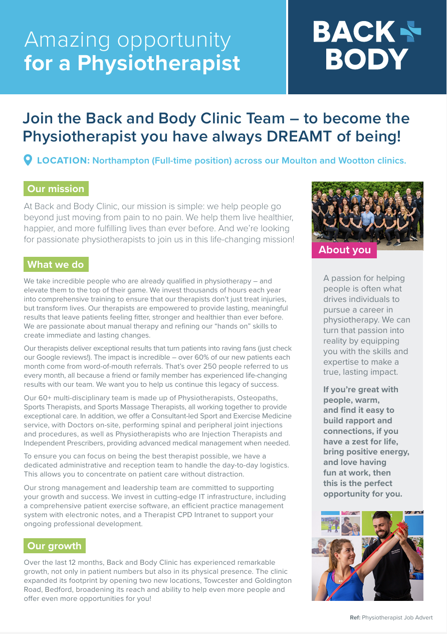 We have taken many (10+) new graduates on as Junior Physiotherapist and Osteopaths and helped support and train them to become part of our fantastic Senior Therapist Team. We offer the Juniors an extensive, supported programme with many hours of training, supervision and shadowing each week. We are so proud of how our Juniors progress so quickly with our advanced training programme into incredible Senior Therapists.